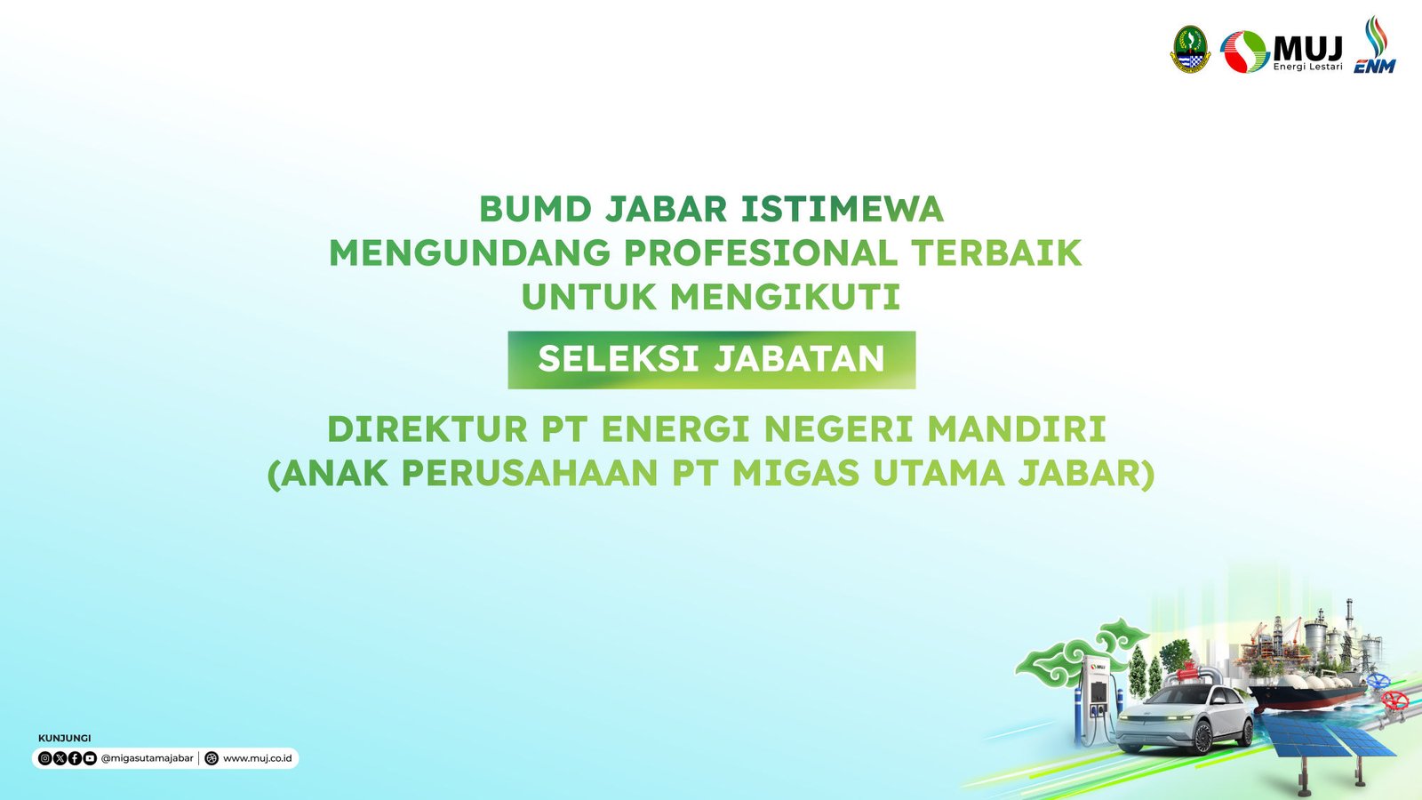 Dalam rangka mengisi kekosongan jabatan Direksi di lingkungan Anak Perusahaan PT Migas Utama Jabar (“MUJ”), Panitia Seleksi dengan ini memberikan kesempatan kepada seluruh Warga Negara Indonesia untuk mengikuti seleksi terbuka calon Direktur PT Energi Negeri Mandiri (ENM) dengan ketentuan sebagai berikut: